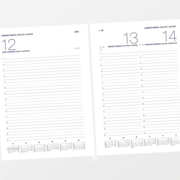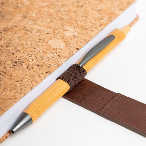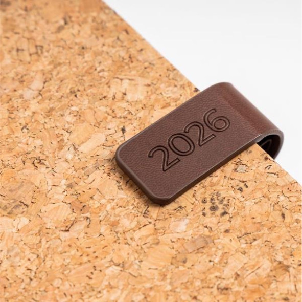 Agenda diária A5. Capa em cortiça e detalhe em PU com fecho magnético. Suporte para esferográfica e fitilho castanho. Com 336 páginas , em papel branco 70gr e certificação FSC (papel proveniente de florestas geridas de forma responsável).Idiomas principais: Português e Espanhol. No interior inclui: espaço para preenchimento de dados pessoais; calendário completo de 2026 e semestre de 2025 e 2027; feriados em lista; plano de férias; plano diário 2026 e espaço para preenchimento de contactos importantes (de A-Z).